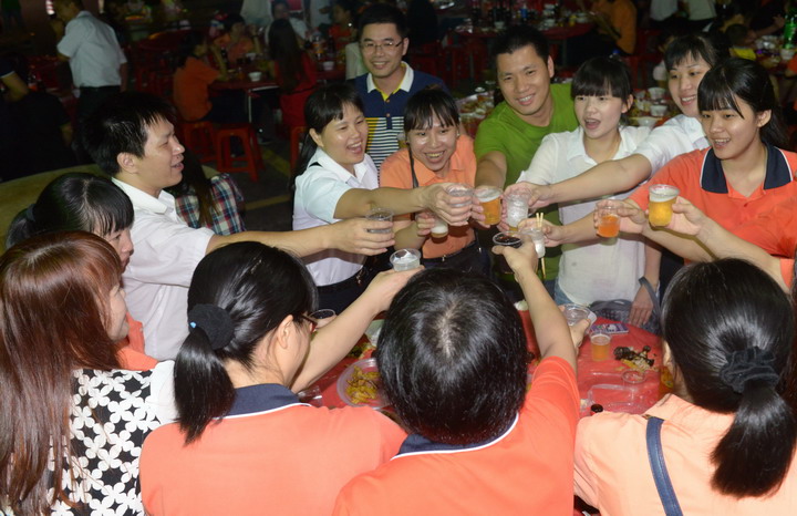 晚上八點(diǎn),圓月高高掛在天空,在一陣舒緩的音樂(lè )聲中,茶話(huà)會(huì )拉開(kāi)了序幕,大家開(kāi)始品嘗美味的花生、雞腳、田螺,喝起了冰爽的汽水、啤酒,熱鬧非凡。期間,劉總依次走到每席前,舉杯向大家送上節日的祝福。這樣的場(chǎng)合里,沒(méi)有了工作時(shí)的正式和嚴肅,大家互道著(zhù)祝福,互敬著(zhù)啤酒。一幫年輕的同事和小學(xué)生家屬,則圍著(zhù)猜迷區,為了一個(gè)個(gè)燈迷而絞盡腦汁。再小一點(diǎn)的孩子家屬,則拿著(zhù)熒光棒互相追逐叫喊著(zhù)。氣氛相當熱烈,相當盡情。